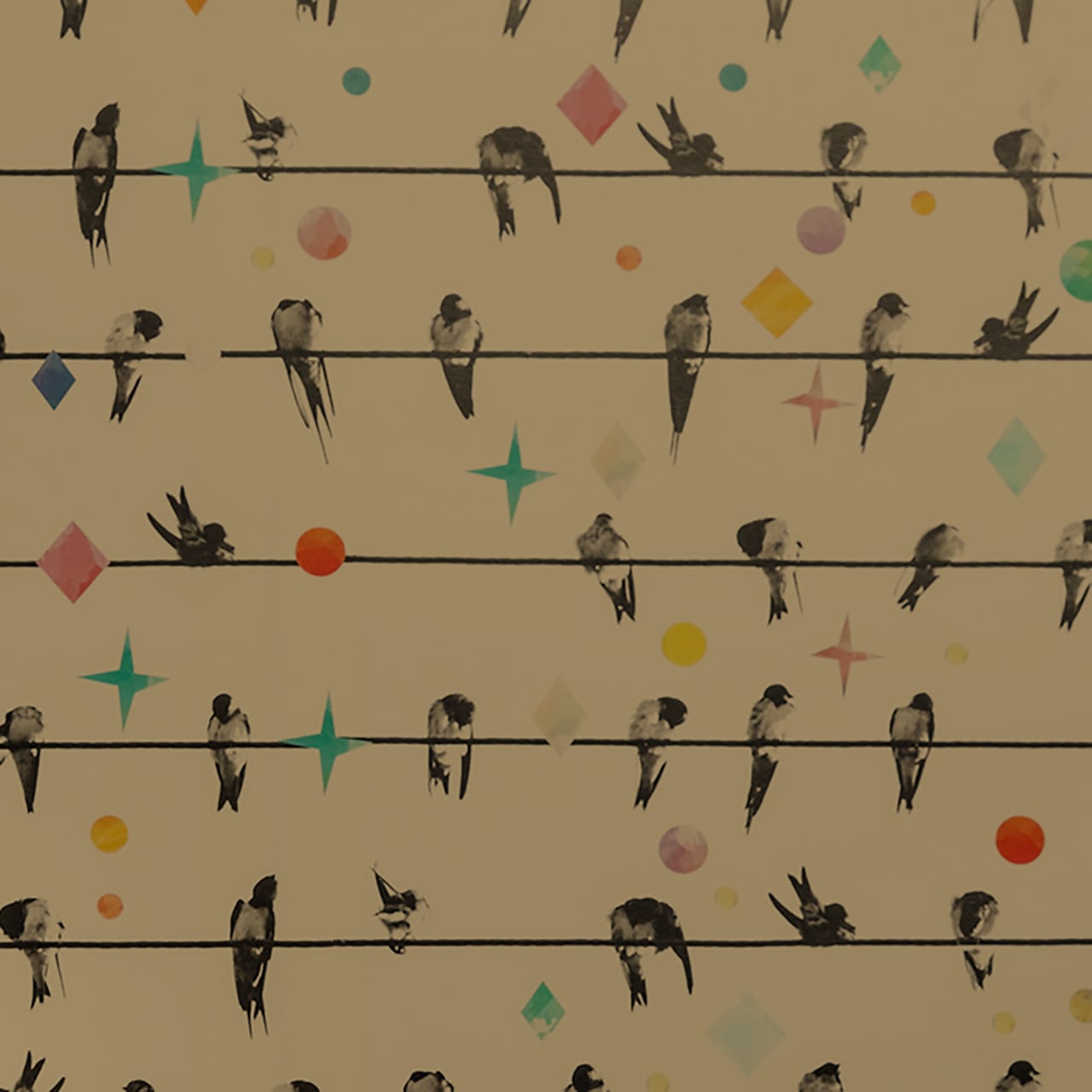 インスパイアされて制作されました。モノクロのツバメに色とりどりの宝石が映える1枚